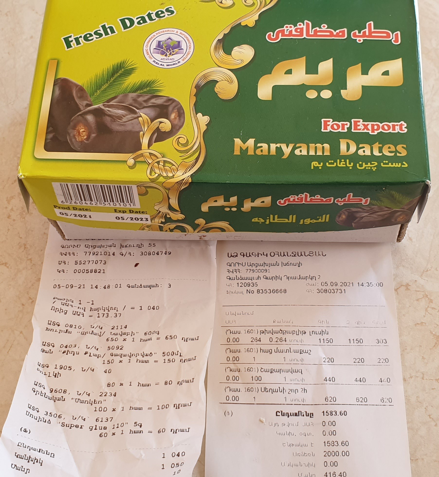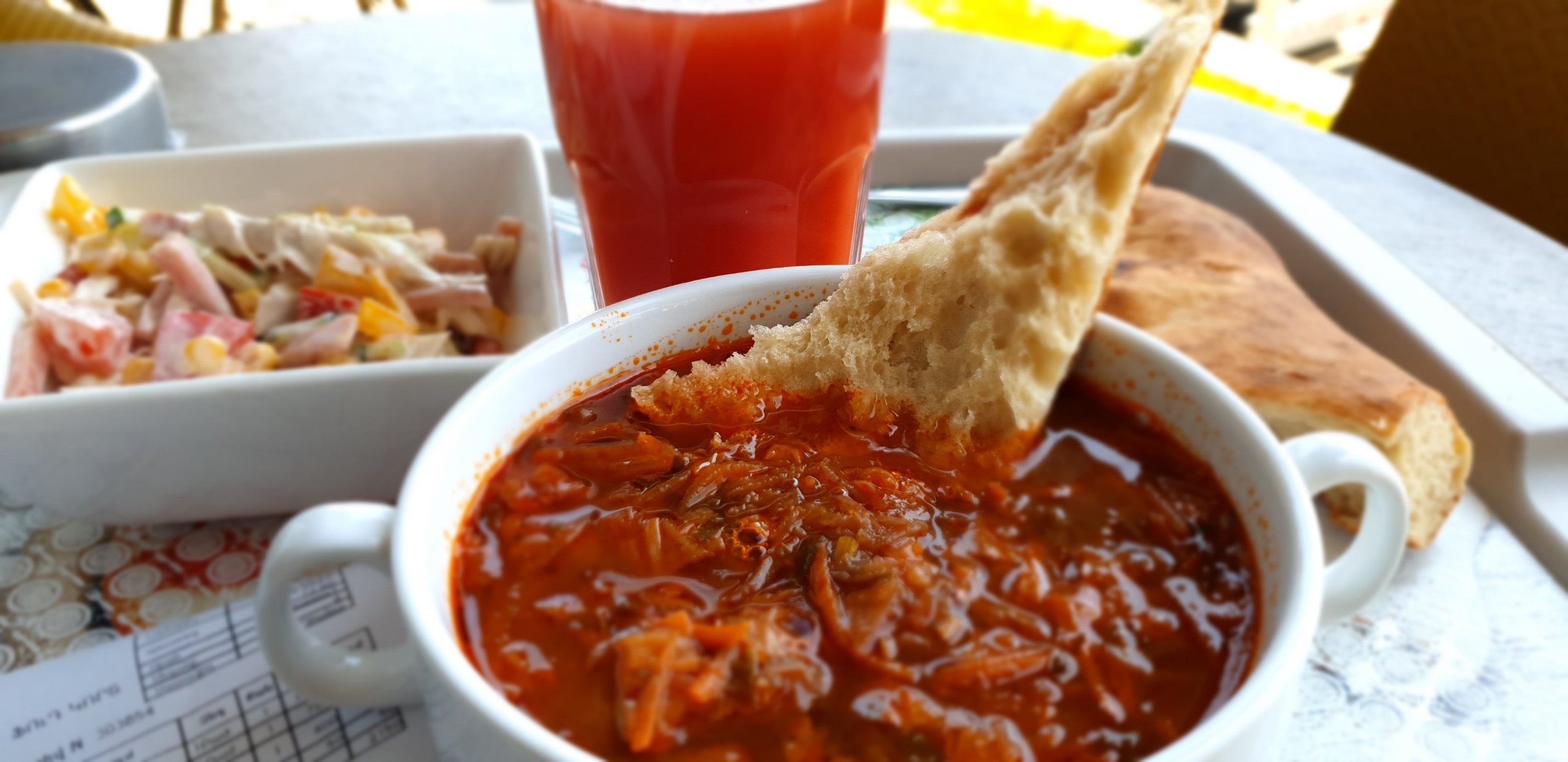 Beim Bäcker gibts Brot für 170dram. Gegenüber hole ich mir eine Suppe(Borsch),Salat und Tomatensaft für 2150dram, dazu noch für 800dram einen Kaffee und Eskimo.
